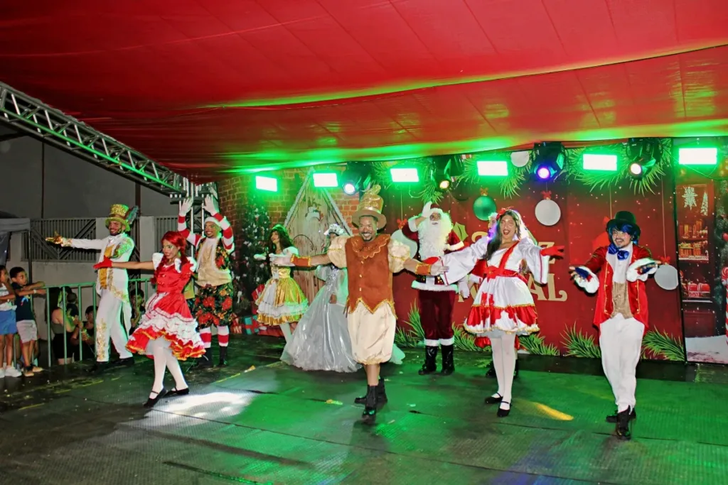 Durante o espetáculo, o público acompanhou diversas apresentações que abrilhantaram a noite, como o ballet municipal, os MÃmicos da Alegria, o espetáculo teatral com a peça âO Presente de Natalâ e a aguardada chegada do Papai Noel, que encantou crianças e adultos.